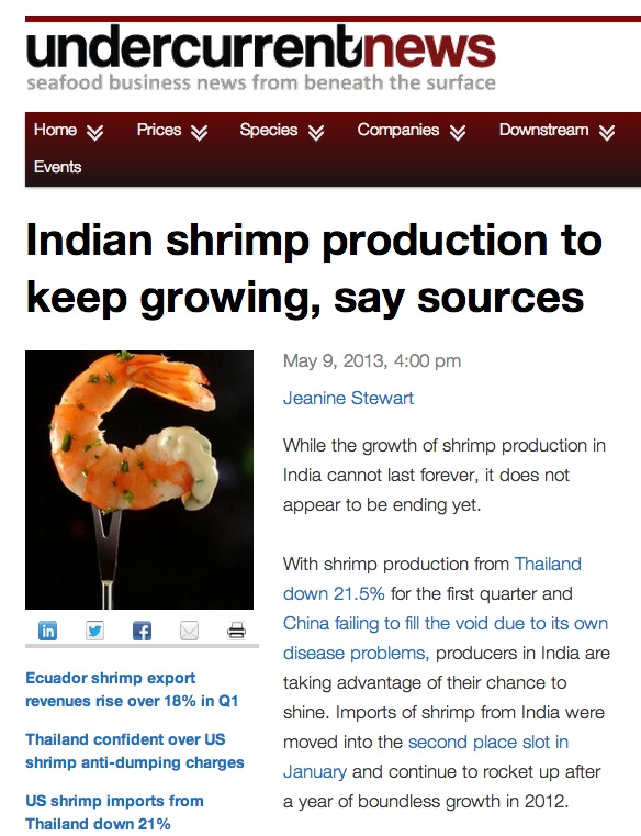 Though China and nearby countries are the center of aquaculture production, it turns out that India is a large and growing player, exporting nearly 550 tonnes of frozen shrimp to the U.S. (apparently from April-December, 2010). Thats a lot of shrimp and has attracted regulators and lawyers to accuse India of “dumping” shrimp on U.S. consumers. India’s Business Standard reports the story here.