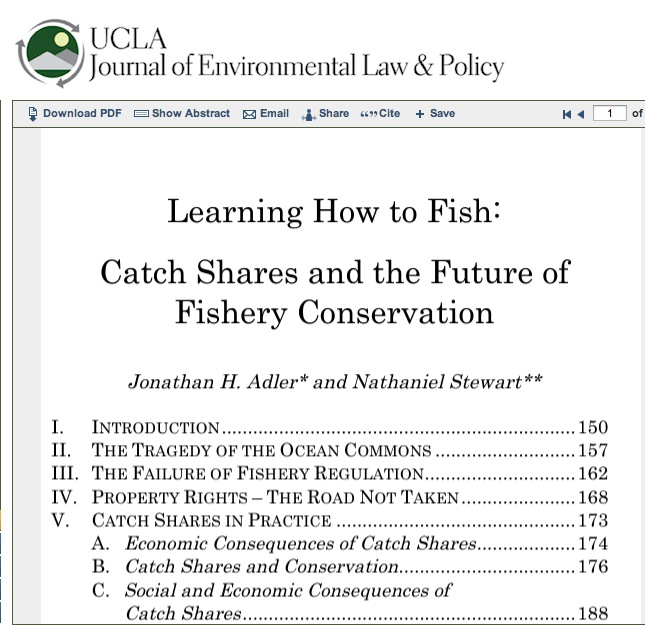 PERC’s note “Learning How to Fish,” links to a 2013 UCLA Journal of Environmental Law and Policy article by Jonathan Adler on the benefits of catch shares. The article can be viewed online and downloaded as a pdf here.