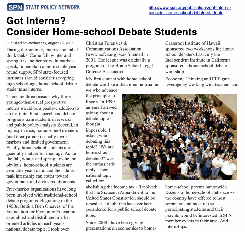 Years earlier, this State Policy Network newsletter article (Got Interns?) suggested SPN members reach out to local and regional homeschool debate clubs for interns.