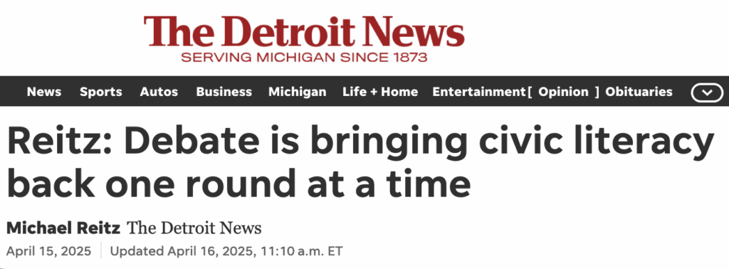 Michael earlier shared his The Detroit News article about judging at a local homeschool tournament: Reitz: Debate is bringing civic literacy back one round at a time.