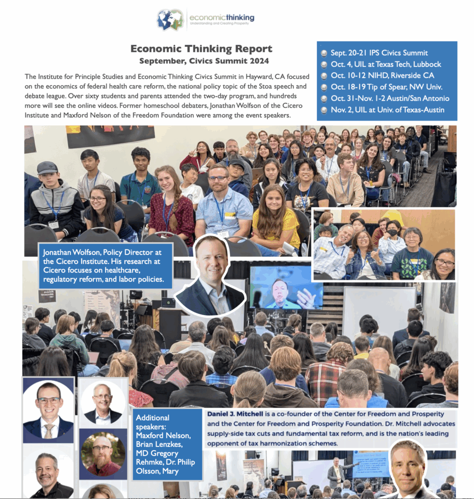 For last fall’s Civic Summit in Hayward, California, we invited as speakers, alumni homeschool debaters active in health care reform (five! and four had attended FEE and Economic Thinking debate workshops).