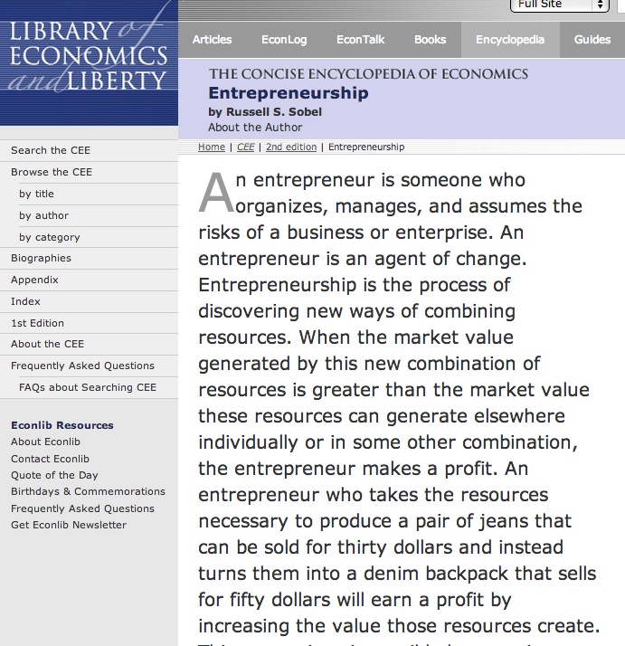 Economic entrepreneurs by contrast look for new enterprise opportunities that create wealth through trade, discovery, or production. Entrepreneurs would search for outside water sources to divert into the river system and for new technologies to conserve water. They would search for ways to connect upstream water users willing to reduce water use for a fee and downstream users willing to pay for additional water. Economic entrepreneurs look for exchange opportunities. Here is the Library of Economics and Liberty entry on Entrepreneurship by Russ Sobel.