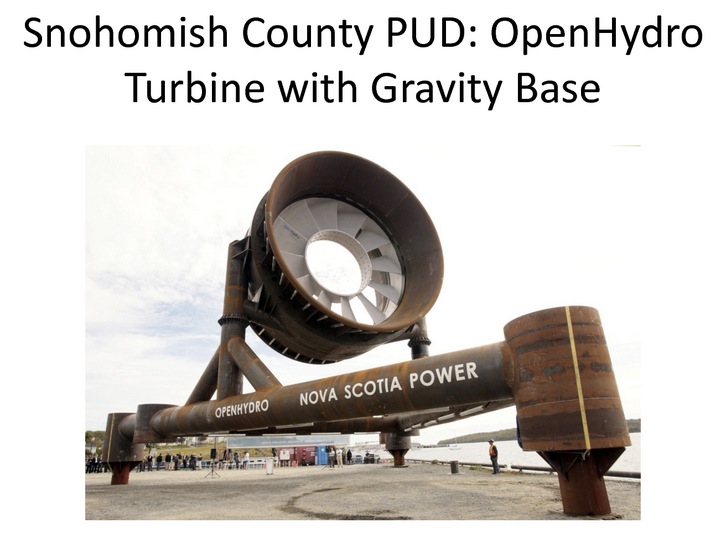 Perhaps the most fun and the least economic project is one testing giant submarine turbines deployed in Puget Sound to generate energy from tidal flows. Each day the tides in Puget Sound flow in and out. Lots of water and lots of potential energy. But how to economically turn tidal flows to useable energy? Underwater turbines can generate energy, but how much and at what cost?