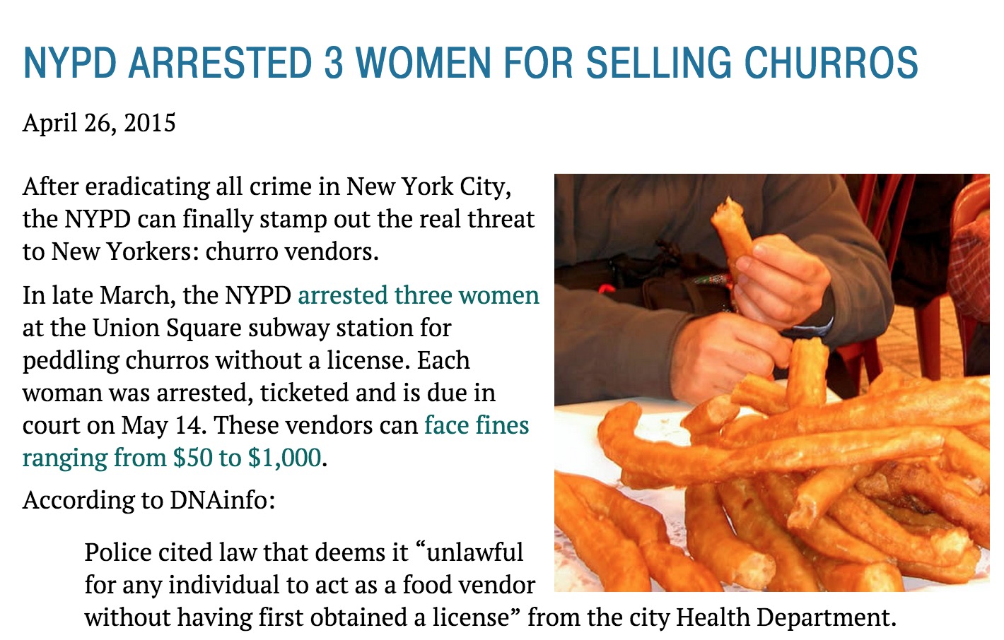 NYPD ARRESTED 3 WOMEN FOR SELLING CHURROS, April 26, 2015: